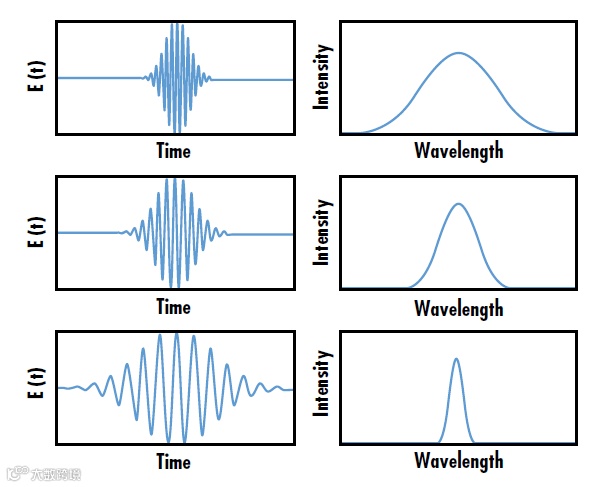 图 1: The wavelength bandwidth of ultrafast laser pulses is inversely related to the pulse duration