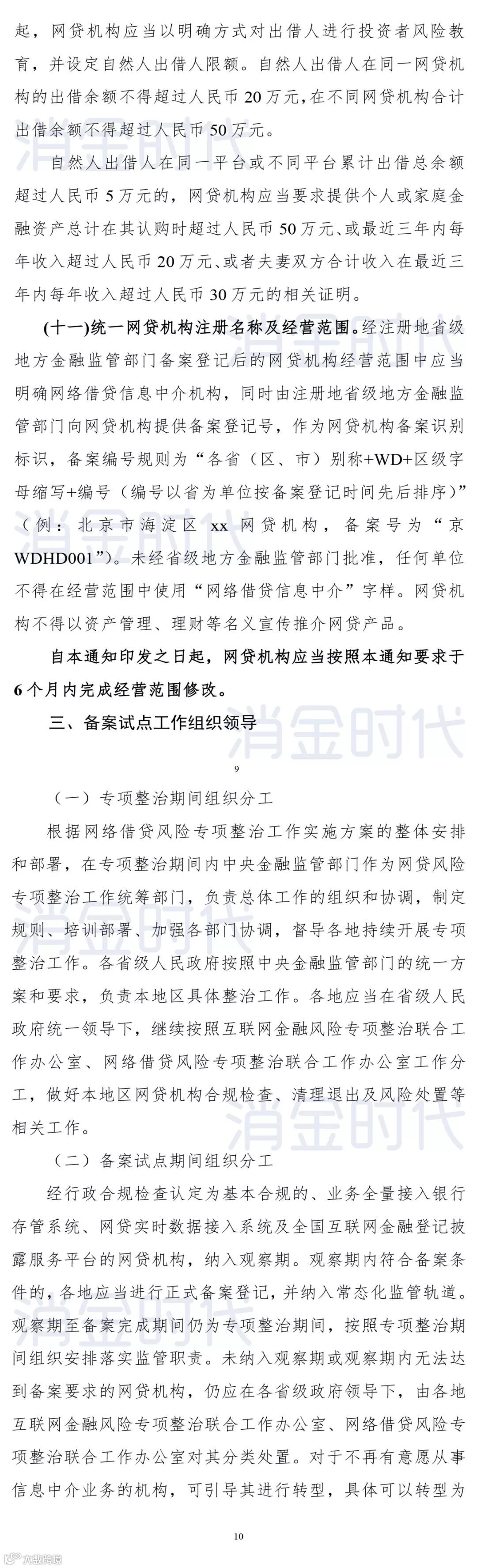 正式启动时间不应晚于2019年6月末。目标是力争于2019年末取得初步成效,完成少量机构的备案登记工作,在总结试点经验的基础上,按照防范重大风险三年攻坚战的总体时限要求于2020年在全国范围内完成存量网贷机构的备案登记工作。