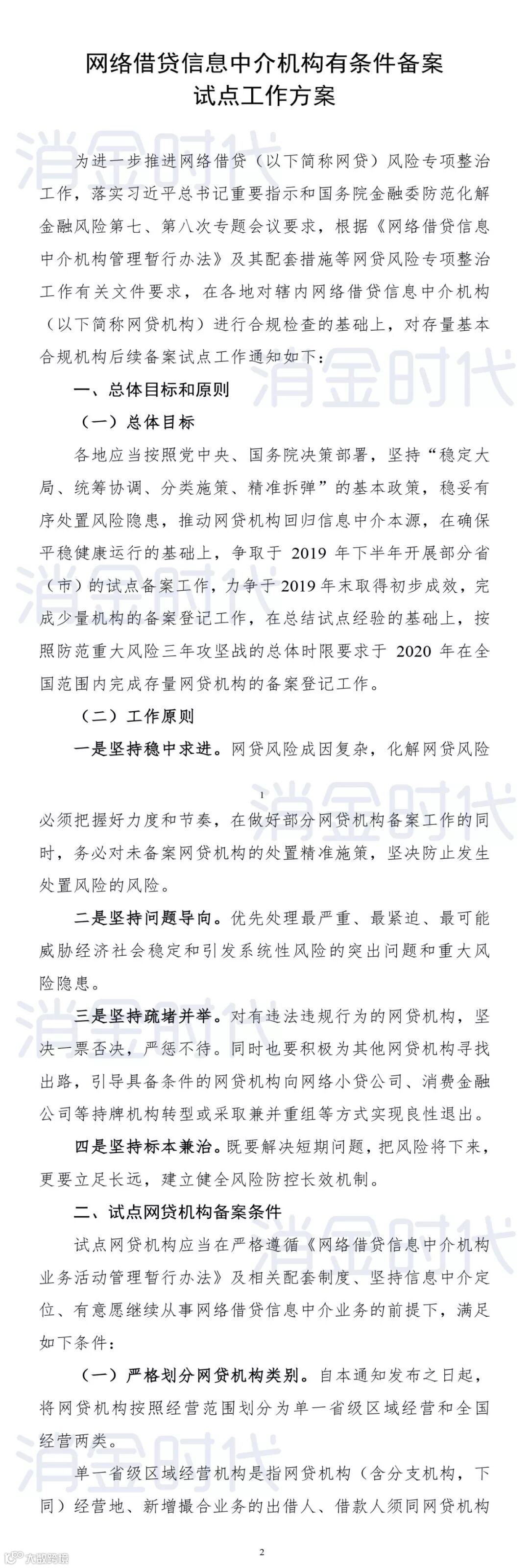 据公众号消金时代报道,目前《网络借贷信息中介机构有条件备案试点工作方案》已定稿。