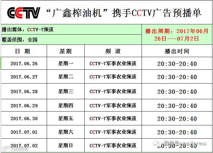 导读:“广鑫榨油机”央视广告本周播放时间为晚上8点半