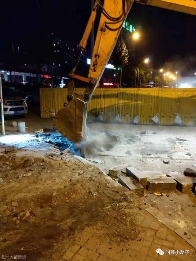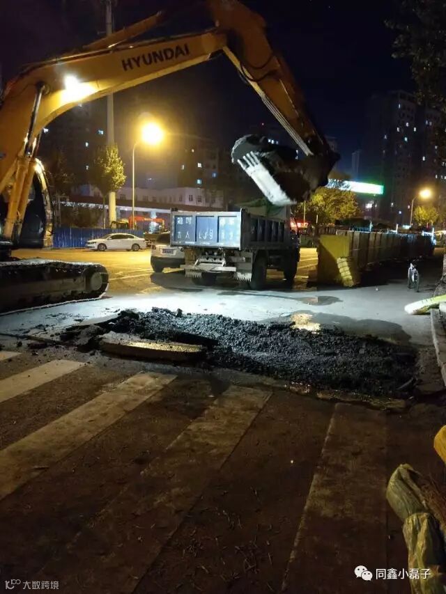 远达与滨河联网工程惠工路段,夜间现场破路 施工单位:绿地供热公司