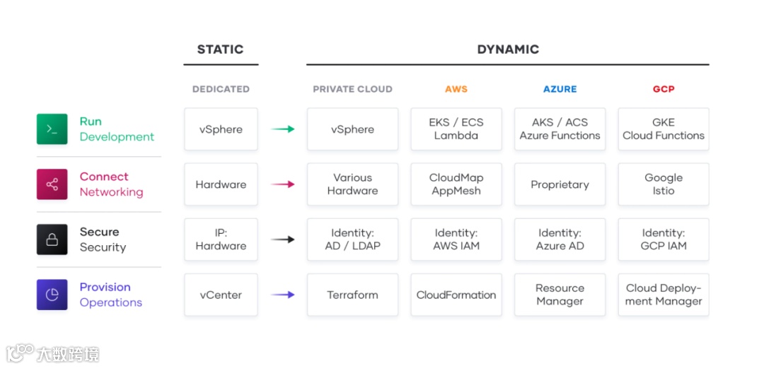 下图很好地说明了云工具的碎片化。从左侧的静态专用基础架构和右侧的动态云和本地基础架构开始,配置等领域是非常特定于云的。每个云平台都有自己的配置工具——例如 AWS 的 CloudFormation、Azure 资源管理器和 GCP 云部署管理器——它们只与各自的平台兼容。这意味着使用这些工具的多云公司不具备工作流可移植性。