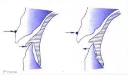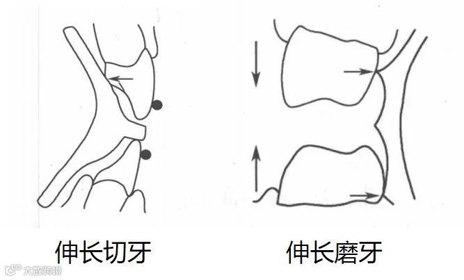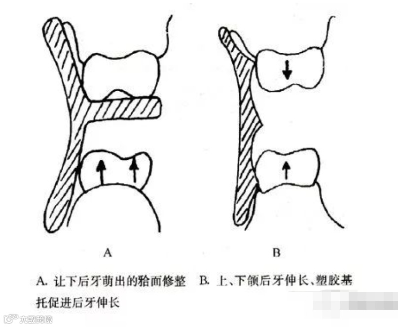 ③ 调磨:对于深覆合的患者,应选择伸长磨牙。选择性调磨磨牙对应的基托面,通过控制和选择性的萌出引导,不仅可以打开咬合,还可以获得良好的尖窝交错关系。