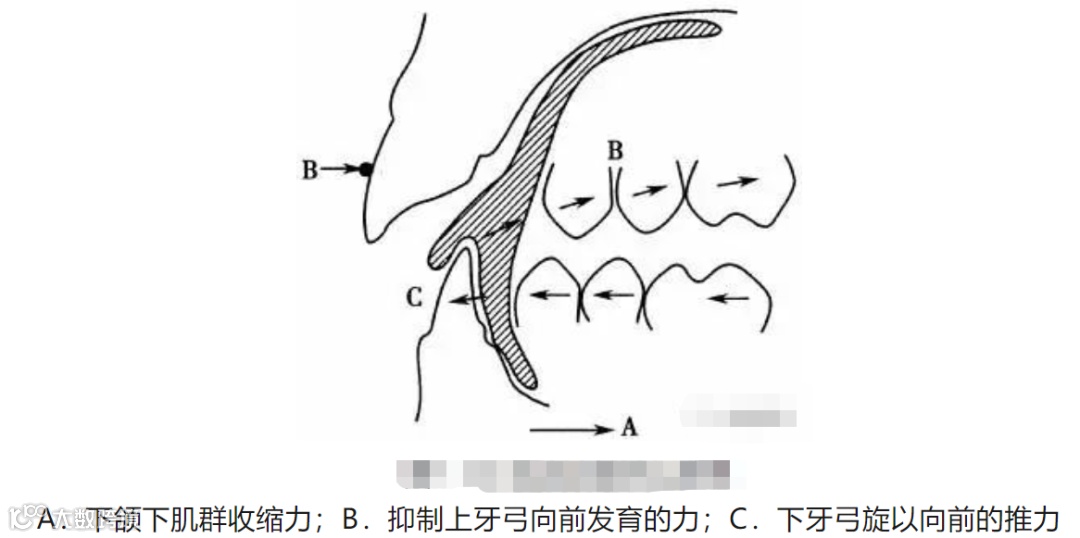 即通过建立新的“功能型”而产生新的“形态型”,刺激了下颌骨失状和垂直向的生长,抑制了上颌骨失状向生长,从而改善上下颌骨的失状不调,达到引导和调控生长的目的。