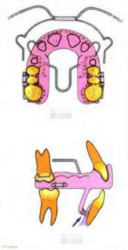 (Ⅱ类患者如伴有上牙弓中段狭窄,下牙弓宽度正常,下颌前伸时形成𬌗干扰,妨碍下颌前伸者,可附加扩弓装置及固位卡环辅助矫治,在扩弓同时前导下颌。)