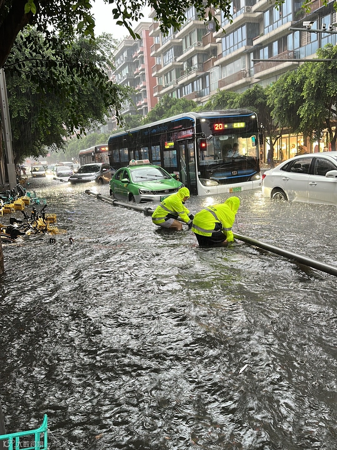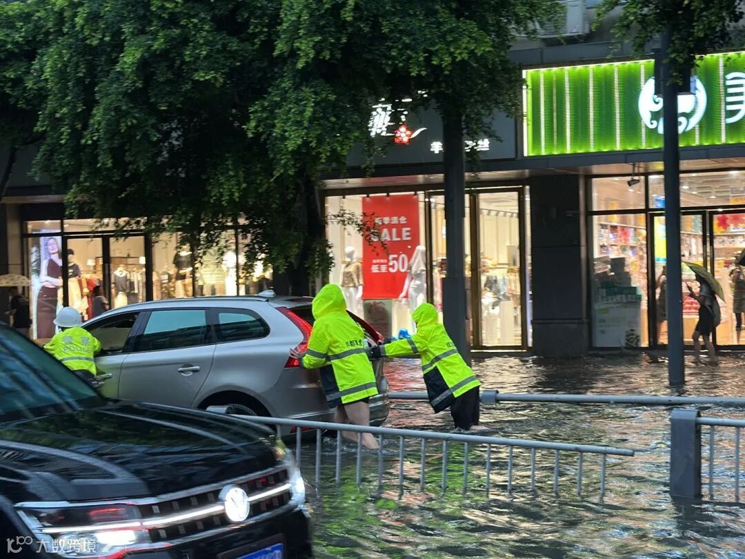 另一边,其他的队员们也在参与这场与“水”的较量。“积水深!慢点开!往边靠!”队员们分工有序,协助交警开展工作——帮忙推行抛锚车辆,用最快速度将车辆推移到安全地带;在危险区域、关键位置设置警示标识,不断提醒过往行人注意安全……这一刻,身穿荧光背心的他们,如同雨中流动的安全信号,给予过往的司机、行人满满的安全感。