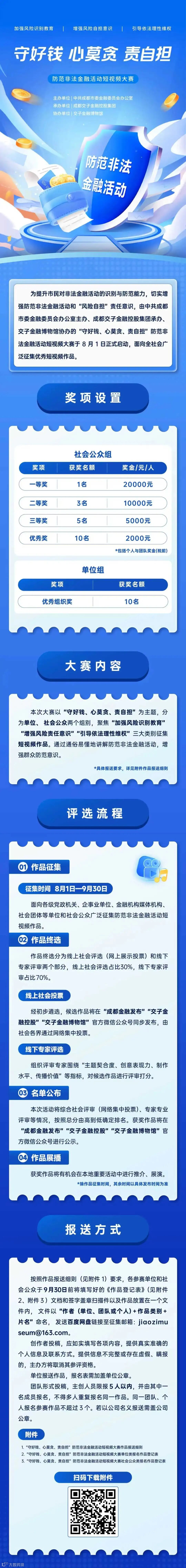 我们再次诚挚地邀请更多短视频爱好者、金融机构、企事业单位及大中专院校学生积极参与,用您独特的视角和生动的镜头,普及金融风险识别知识,强化风险自担意识,共同为提升社会公众的金融安全意识贡献力量!