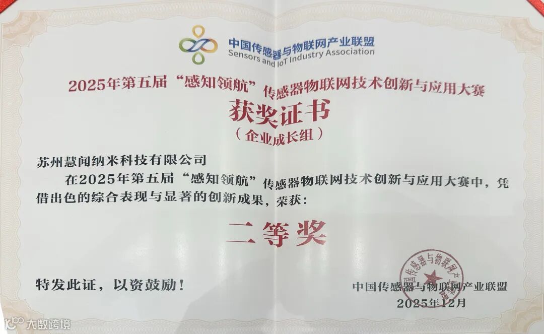 本次评选中,慧闻科技基于自身的纳米材料技术结合先进的智能传感器产业,以热导气体传感器及应用技术荣膺2025年第五届"感知领航"传感器物联网技术创新与应用大赛二等奖!