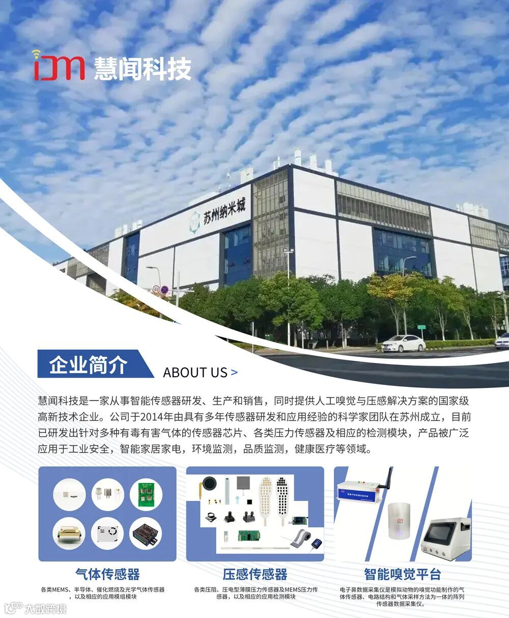 苏州慧闻纳米科技有限公司是一家专业从事智能传感器研发、生产和销售,同时提供人工嗅觉与压感解决方案的国家级高新技术企业。公司于2014年由具有多年传感器研发和应用经验的前美国宇航局科学家团队成立,目前已研发出针对多种有毒有害气体传感器芯片及相应的检测模块,在江苏昆山和浙江湖州分别建成了MEMS气体传感器、热电堆温度传感器、柔性压力传感器、红外CO2传感器模组、激光PM2.5传感器生产线。公司开发的用于锂电池安全监测模块和集成气体、烟感和温度的多合一电池安全监测设备也广泛用于储能电站和新能源工程车等领域。