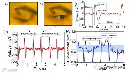 由于眼疲劳可以通过眼睑运动识别,柔性压电传感器则可来监测实时眼睑运动,从而评估眼睛的疲劳状态。传感器的核心功能部分由压电薄膜制成,传感器的整个厚度为微米级,因此在眨眼期间可以保持与眼睑皮肤的保形接触。进行机械负荷测试和体内测试来验证传感器的功能和效率,以监测实时眼睑运动。并开发了一种简单的理论机电模型,将传感器的输出电压与眼睑的物理运动相关联,从而进一步证明了传感器的功能,用于监测和评估眼睛疲劳。