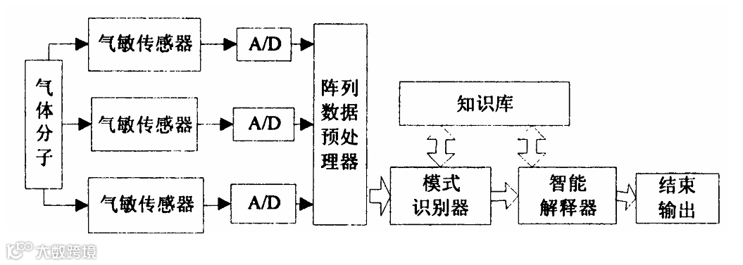 电子鼻的工作可简单地归纳为:传感器阵列、预处理电路、神经网络和各种算法、计算机识别。一个典型的电子鼻主要由三部分组成: