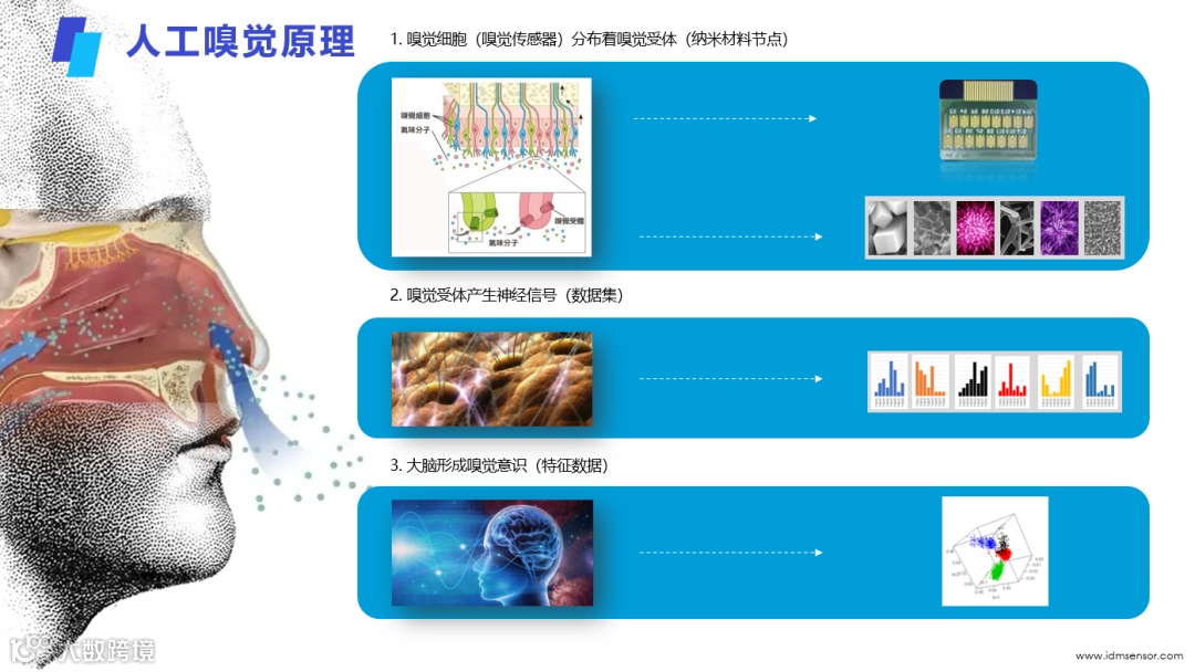 (1)气味分子被人工嗅觉系统中的传感器阵列吸附,产生信号;