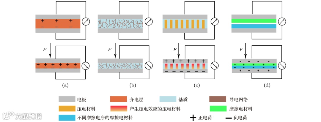 不同形式的压力传感器 (a)电容型; (b)电阻型; (c)压电型; (d)摩擦电型