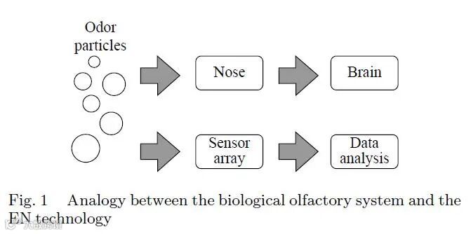 上图展示了生物嗅觉系统(biological olfactory system)与电子鼻技术(EN technology)的相似之处。电子鼻的电子传感器阵列(electronic sensor array)对应着鼻子的嗅觉感受器(olfactory nose receptors),可检测空气中的化学物质。在生物嗅觉系统中,被感受和捕捉的气味分子会作为输入信号传入嗅球(olfactory bulb),由嗅球对气味信息进行处理。而后,大脑中的嗅皮质(olfactory cortex)对气味进行描述,并最终识别出气味。