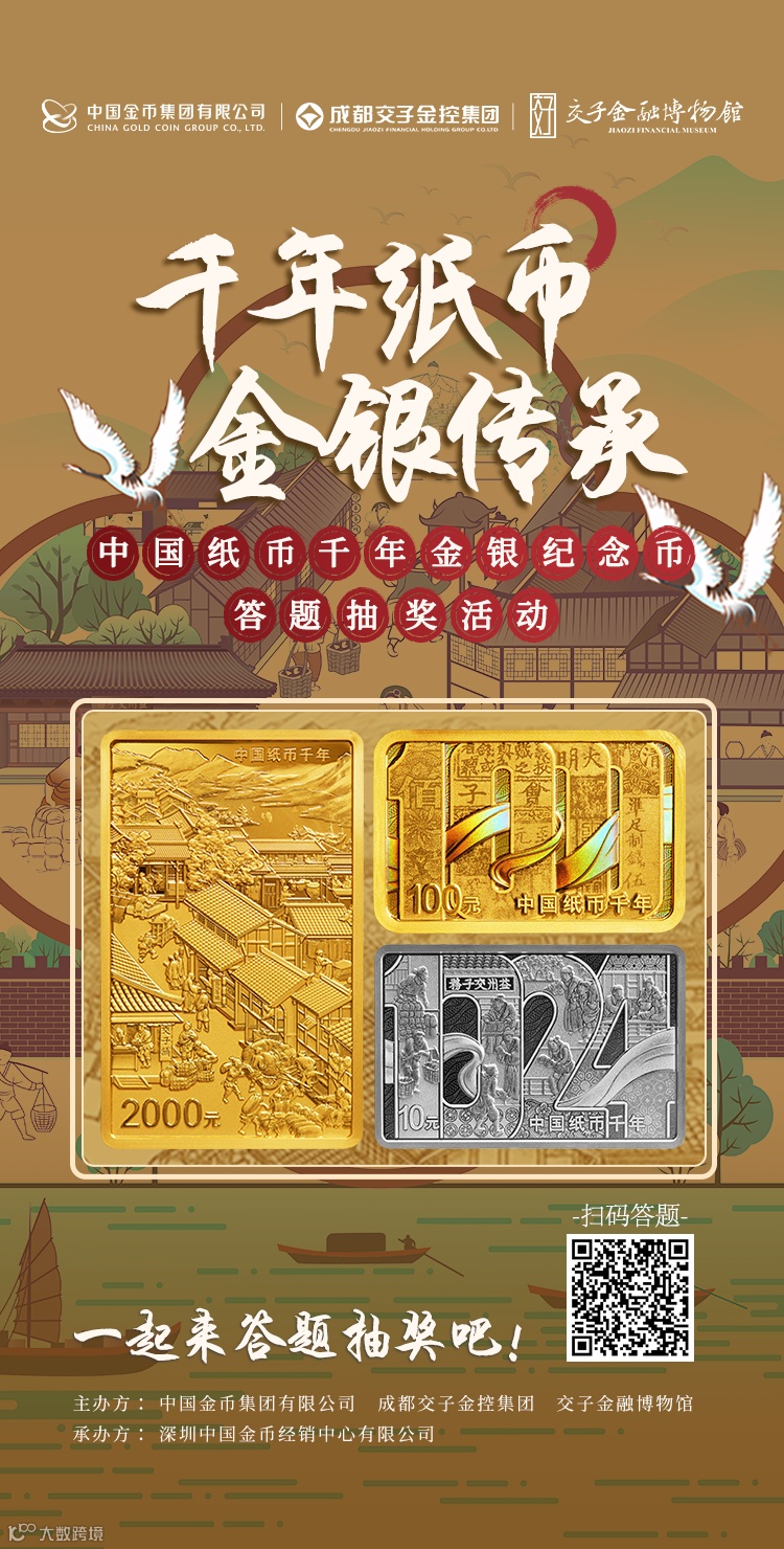 为了传承与弘扬中华纸币文化,彰显中国古代金融创新成果,中国金币携手成都交子金控集团、交子金融博物馆特别推出“千年纸币,金银传承——中国纸币千年金银纪念币答题抽奖活动”。