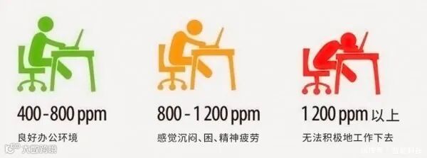 例如,众所周知的CO2浓度过高的问题。正常情况下,空气中氧气和二氧化碳的含量相对稳定,氧气占21%,,二氧化碳占0.03%。虽然二氧化碳本身没有毒性,但当空气中的二氧化碳含量超过正常水平时,人体会感到昏昏沉沉的不适。