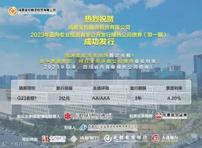 2023年7月28日,金控租赁在上海证券交易所成功发行2023年面向专业投资者非公开发行绿色公司债券(第一期),完成公司在资本市场首次亮相。本期债券为2023年以来,四川省内首单绿色公司债券,发行规模2亿元,发行期限3年,票面利率4.2%,创中西部地区、同行业同评级公司债券最低利率。