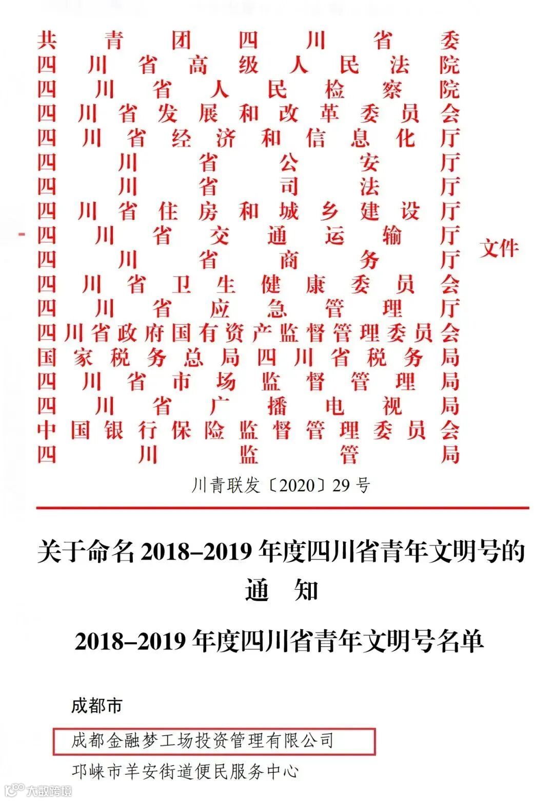 交子金融梦工场荣获“2018-2019年度四川省青年文明号”称号。
