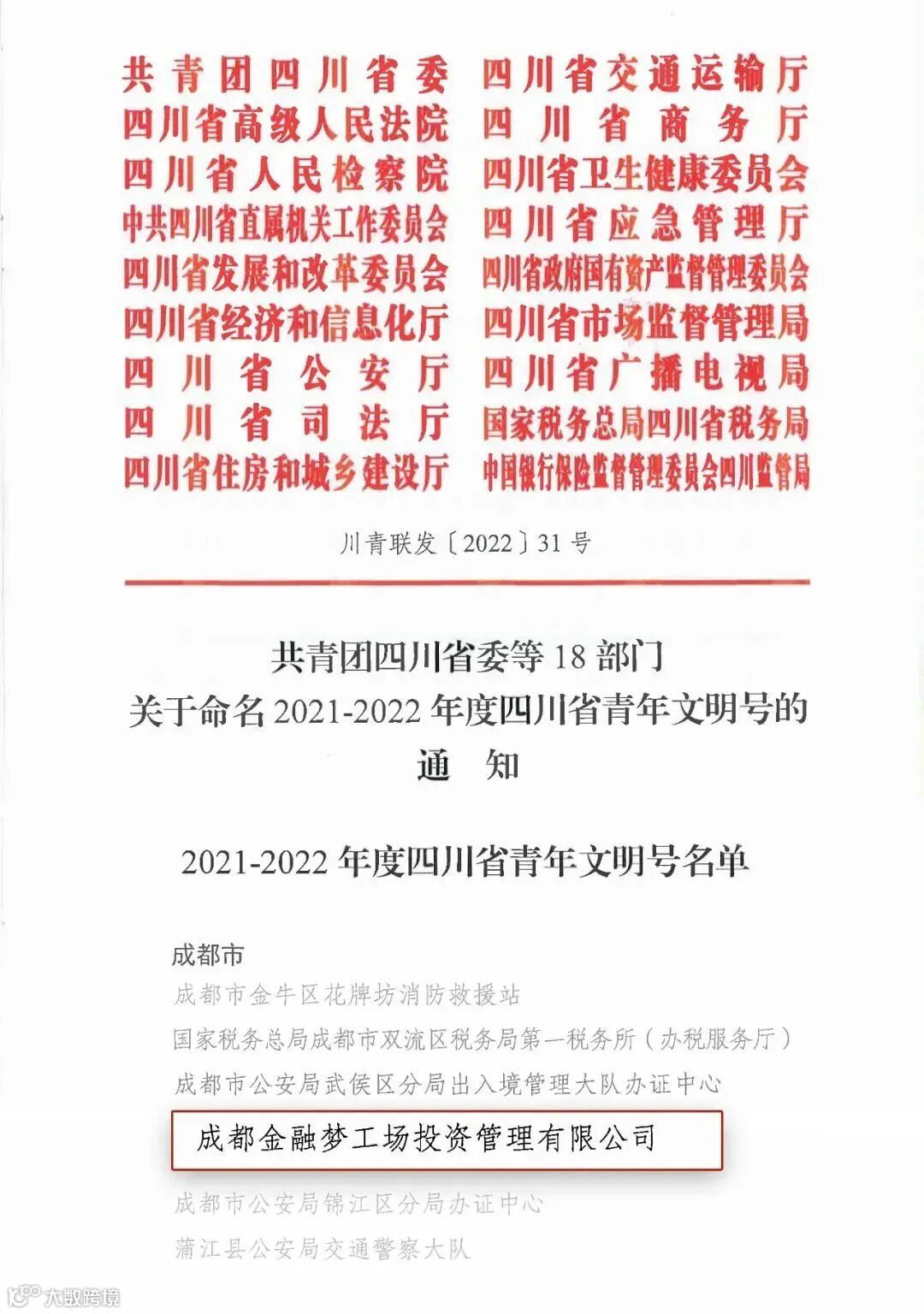 梦工场公司荣获“2021-2022年度四川省青年文明号”称号。