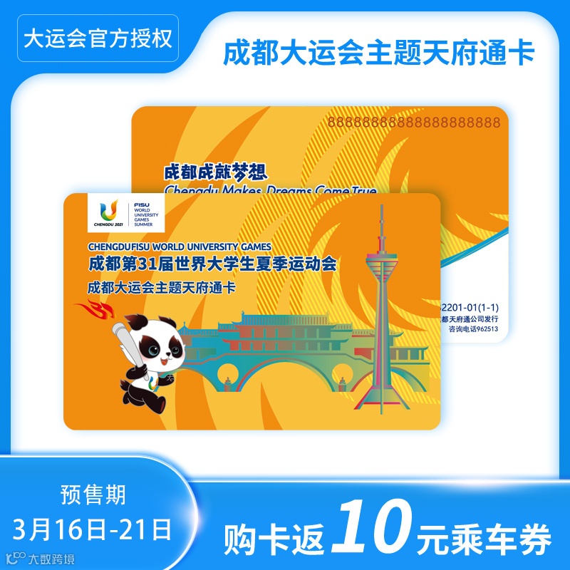 秉持“办赛、营城、兴业、惠民”的初衷,大运会执委会携手天府通将大运会的理念与品牌,生动传播到市民中,在倒计时100天之际,特别推出“成都大运会主题天府通卡”,旨在将大运文化厚植于市民生活中,提升大运全民影响力,服务市民公共交通出行。
