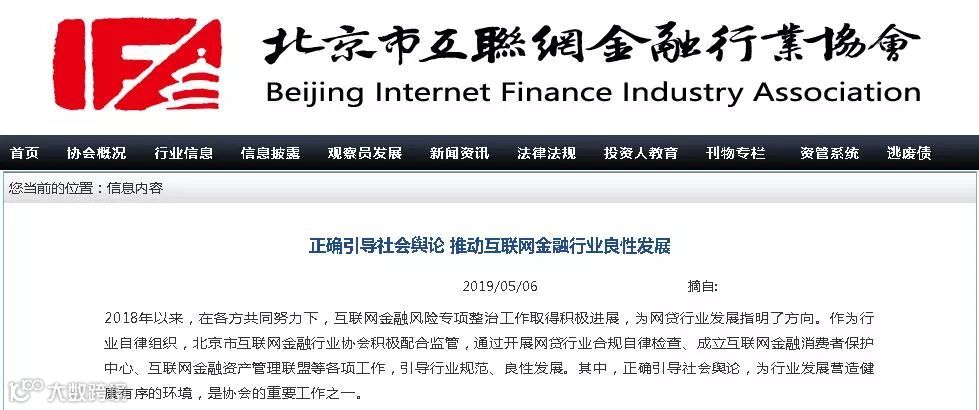 5月6日,北京市互联网金融行业协会在其官网发表文章,呼吁正确引导社会舆论,为行业发展营造健康有序的环境。