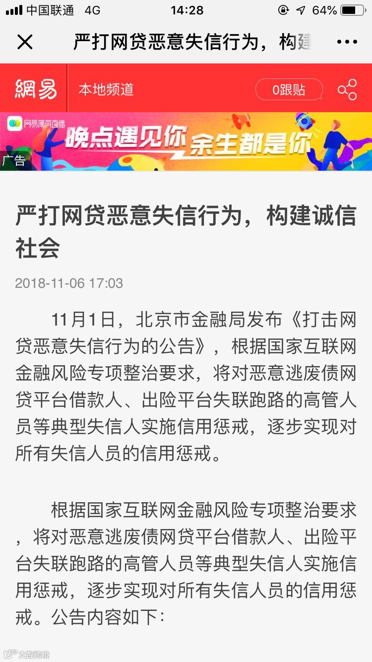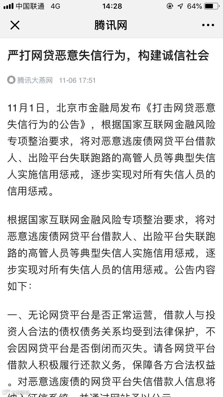 11月1日,北京市金融局发布《打击网贷恶意失信行为的公告》,根据国家互联网金融风险专项整治要求,将对恶意逃废债网贷平台借款人、出险平台失联跑路的高管人员等典型失信人实施信用惩戒,逐步实现对所有失信人员的信用惩戒。