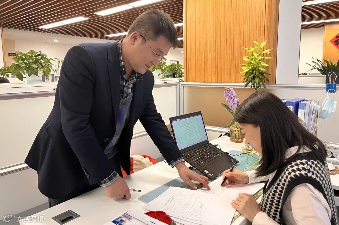(刘喜军正在与同事对接工作)