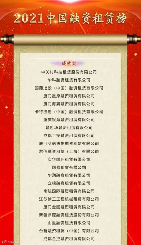 近日,金控租赁公司上榜 “2021中国融资租赁榜”,成为全国25家获得年度成就奖的融资租赁公司之一。