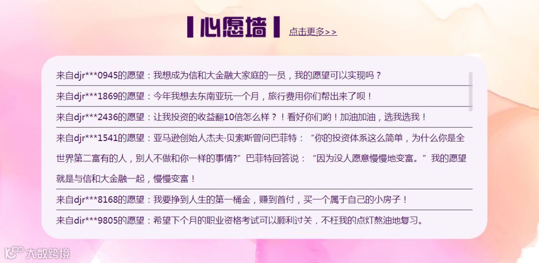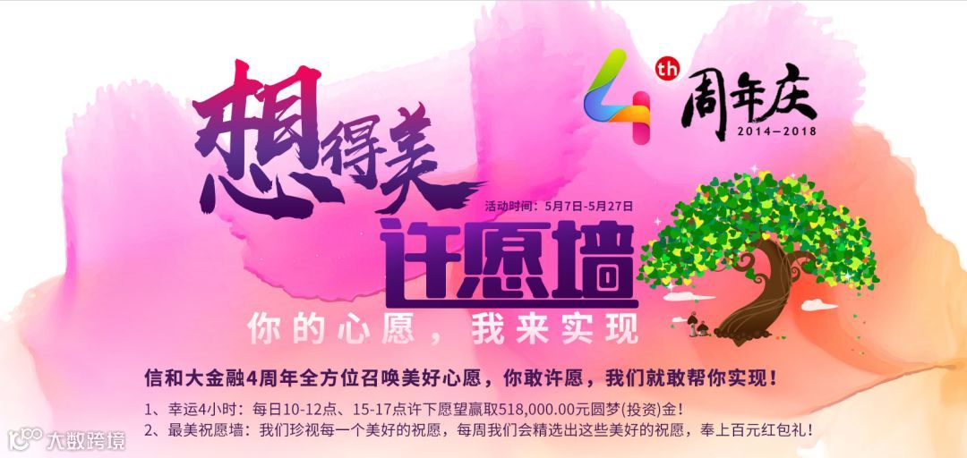 参与许愿活动需注册成为信和大金融认证用户,每位用户登录后可多次许愿,限获奖1次;许愿内容更走心、活动期间投资金额更高的用户,被选中的机率就越大哦。