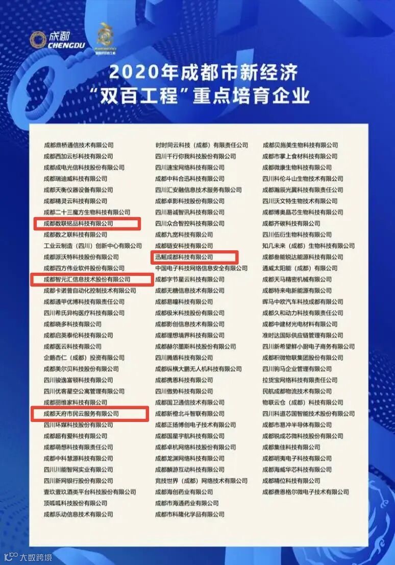 交子金融梦工场入驻企业数联铭品、迅鳐科技、智元汇,与成都天府市民云入选“双百工程”重点培育企业,相关企业的曾途、夏琦、邓波、李泉入选“百名优秀人才”名单。