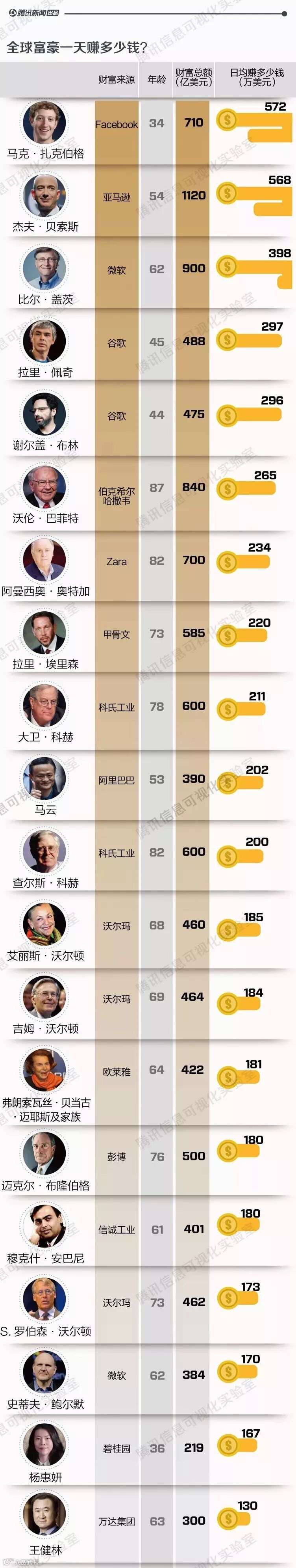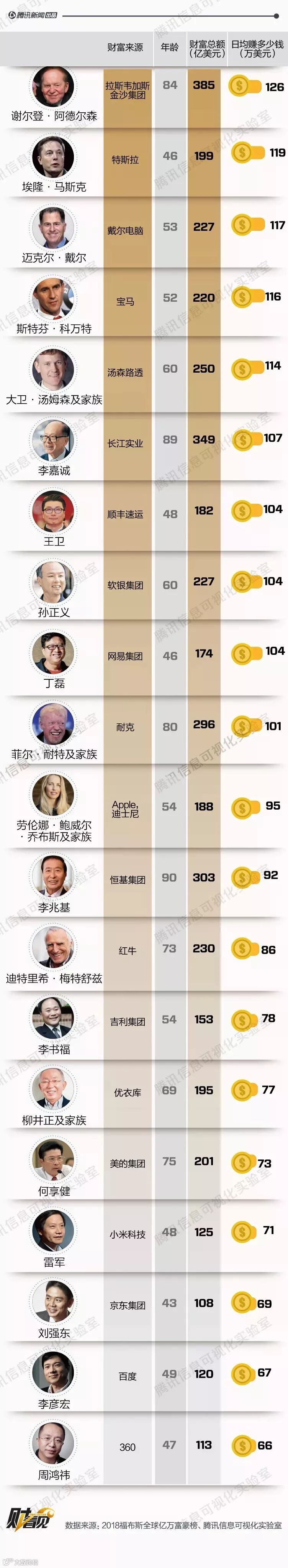 可是没有比较就没有动力。根据2018福布斯全球亿万富豪榜上,诸位富豪的年龄和净资产,算出了他们每人平均每天赚多少钱,并按从多到少做了排名。
