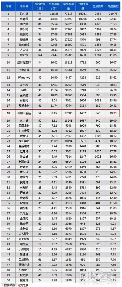 可喜可贺的是,信和大金融以势不可挡的姿态冲进了TOP 50榜单中,并取得了第18名的好成绩,强势领先绝大多数P2P网贷平台!