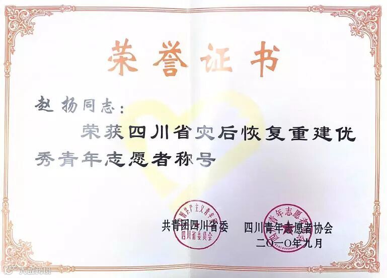 因在抗震救灾及西部计划志愿者的工作经历,赵扬于2010年获得了“四川省灾后恢复重建优秀青年志愿者” 称号。