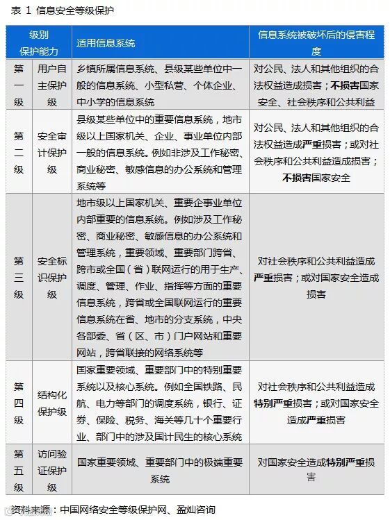 按照国家标准《计算机信息系统安全保护等级划分准则》GB17859-1999规定,计算机信息系统实行五级保护。即从保护能力上划分为五级,以第一级为基础逐级增强。各等级信息系统的保护能力及被破坏后的侵害程度如下表所示: