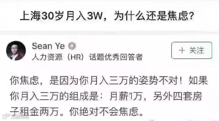 最后,小编认为,焦虑背后的实质并不是收入多寡导致的。如果收入姿势不对,不要说月入三万,就是月入十万,在上海北京这样的城市,一样会焦虑。在今天这样的时代,金钱虽不能缓解精神上的焦虑,但却可以极大提升我们在物质抉择上的主动权。我们期待的诗和远方、我们想要的包包、想吃的美食,这些都只能通过金钱方能实现。