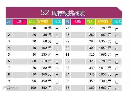 52周存钱法主要是培养大家一个储蓄的习惯,脑袋里时刻有一根积少成多的弦。所以,按照这样的主旨,金额目标要适当,不要中途断档,也不要中途拿这笔钱出来做它用(可单独办张银行卡用来储蓄)。