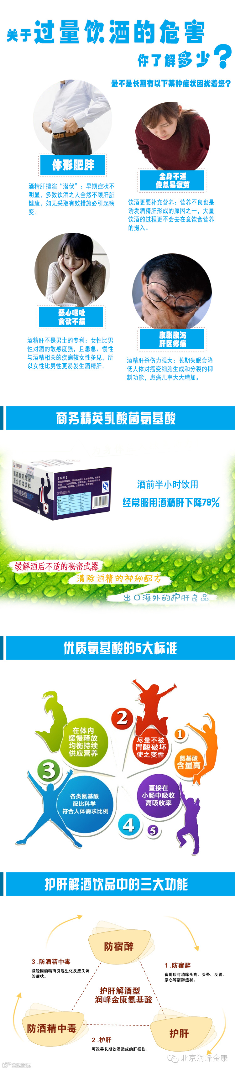 含有肝脏所需要的解酒氨基酸及玉米肽,同时也含有人体肝细胞解毒功能,同时解决饮酒后对小脑和纹状体的损害,减少身体对酒精的依赖,有减轻酒精中毒的作用,调节机体对酒精的代谢,促进酒后肌体的恢复,减少酒后的疲惫,胃肠紊乱,记忆力下降等等酒后症状,同时减轻因为酒精中毒引起手震颤等现象