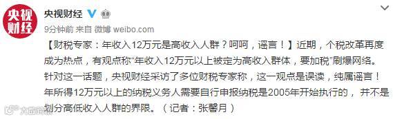 财政部方面对这则消息也辟了谣,表示从来没有将“12万”跟“高收入”具体挂过勾,加税也是误读。
