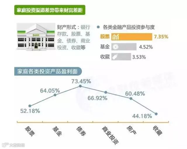 报告显示,从城乡家庭的投资渠道看,在参与各类金融产品投资的家庭中,股票的投资参与度相对最高,占到了全部调查家庭的7.35%。投资基金的家庭占全部家庭的4.52%,投资收藏的家庭只占到全部家庭的3.53%。城镇家庭对各类金融产品投资的参与度都要高于农村家庭,10.56%的城镇家庭进行了股票投资,这一比重约是农村家庭的4倍。
