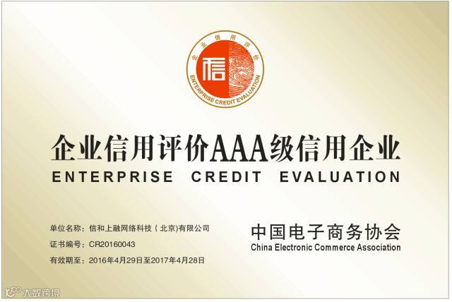 5月,信和大金融荣获中国电子商务协会颁发的“企业信用评价AAA级信用企业”。信和大金融将通过合法合规经营,扎实做好内功,把安全、诚信观念落实到每一项工作之中,为自身立则,为行业树影。
