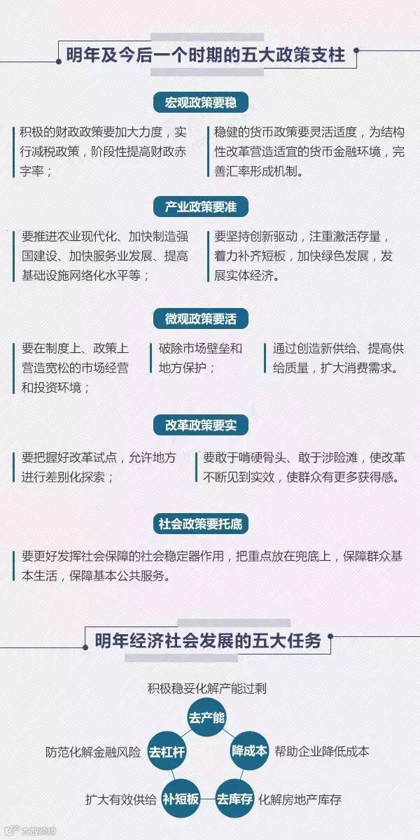 去库存对应去房地产库存(后文会详细展开);去杠杆对应控制金融风险;降成本主要通过降低税费和调整能源价格实现,其中,降低制造业增值税对于控制企业成本意义重大,降低社会保险费,研究归并“五险一金”,将增加就业者的实际收入。补短板主要是补齐民生、产品、产业方面的短板,强化扶贫、产品和产业升级、农业等领域工作。