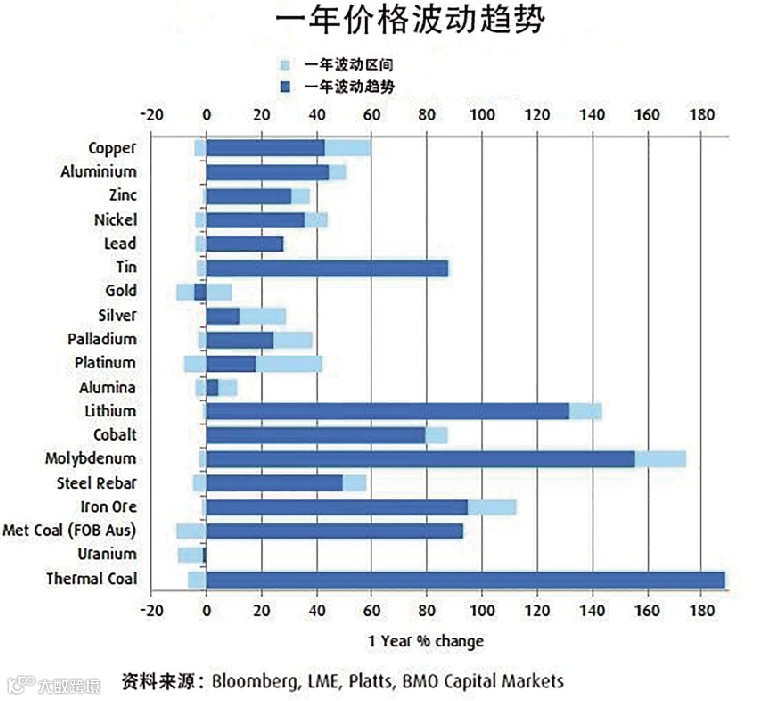 过去一年,包括金属在内的所有大宗商品的价格都在大幅上涨,在今年剩余的时间里,价格上涨的趋势会有所放缓:“全球工业生产增长率现已见顶,在较长时间内,大宗商品的价格将维持在当前的较高水平上。需求动能开始减弱,这是年底现货价格预期下降的主要原因。”BMO分析。