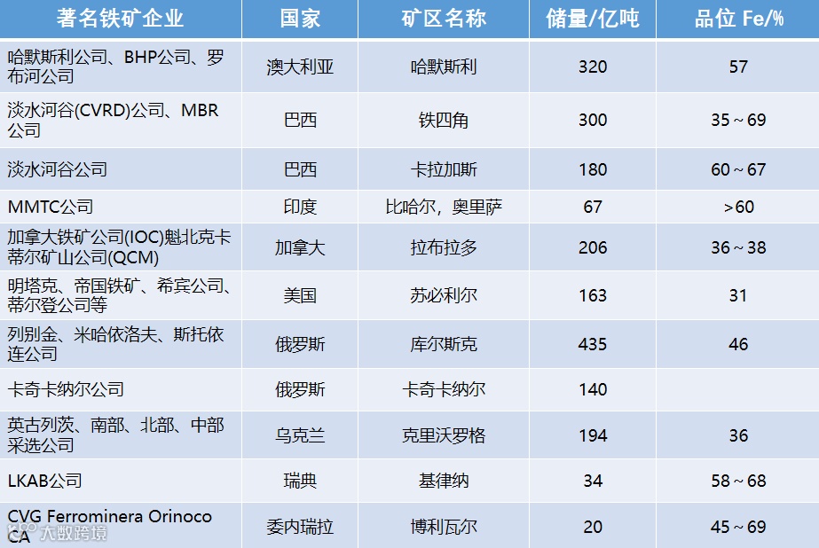 根据《世界钢铁协会》和《全球金属网》统计资料,全球铁矿储量又相对集中分布在以下巨型铁矿区 (带)中,它们是:澳大利亚的哈默斯利、巴西的卡拉加斯和“铁四角”、加拿大的拉布拉多、美国的苏必利尔湖区、俄罗斯的库尔斯克和卡奇卡纳尔、乌克兰的克里沃罗格、哈萨克斯坦的图尔盖、巴西和玻利维亚交界的穆通—乌鲁库姆、印度的比哈尔邦—奥里萨邦、中央邦及卡纳塔克邦、中国的鞍本—冀东、攀西及法国的洛林、瑞典的基鲁纳、委内瑞拉的玻利瓦尔、南非的赛申—德兰士瓦、西非(利比里亚和几内亚)的宁巴山—西芒杜等,这些铁矿区(带)不仅在本国占有主导地位,而且也拥有目前全球铁矿储量的85%和产量的90%以上,是全球钢铁工业生产的铁矿资源基地和开采中心。