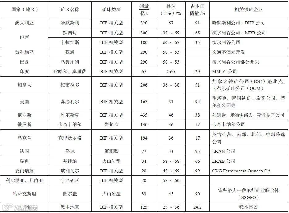全球重要大型铁矿区类型、储量分布情况