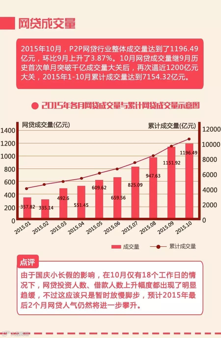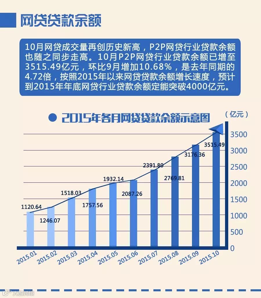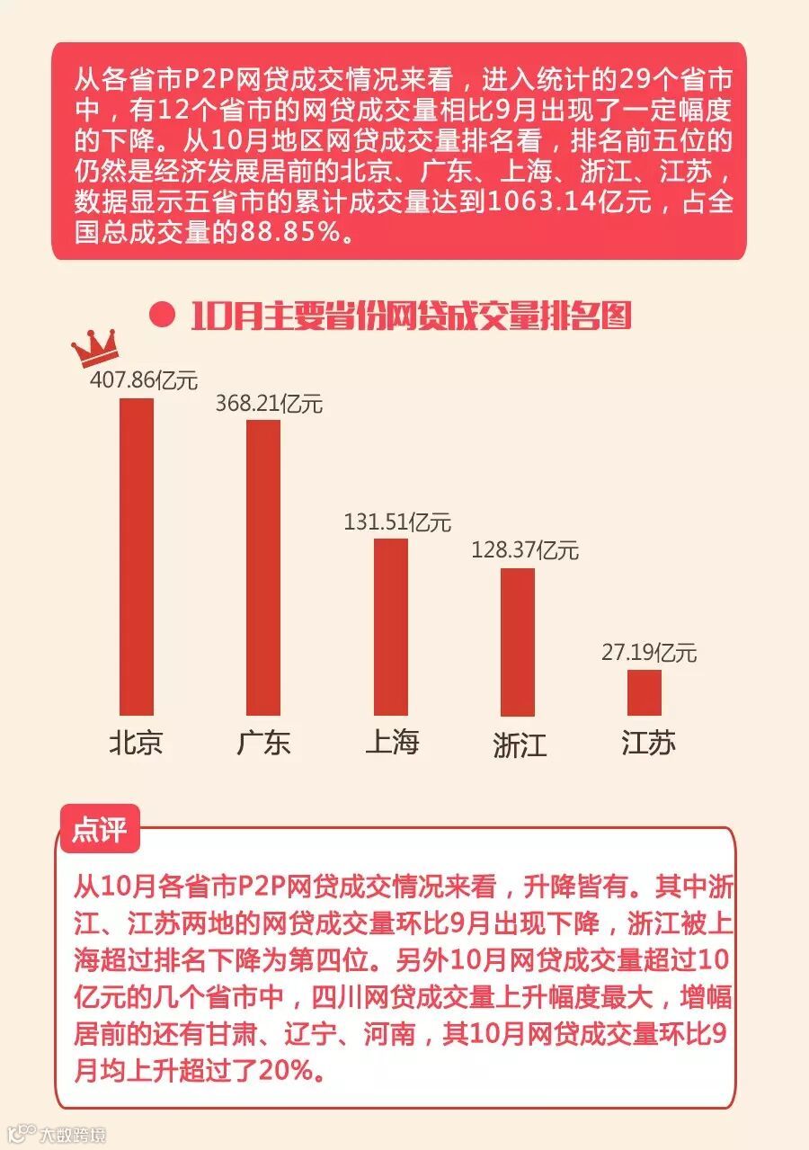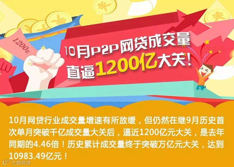 10月网贷行业成交量增速有所放缓,但仍然在继9月历史首次单月突破千亿成交量大关后,逼近1200亿元大关,是去年同期的4.46倍!历史累计成交量终于突破万亿元大关,达到10983.49亿元!