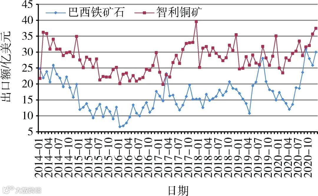 图8 巴西铁矿石和智利铜矿月度出口额变化