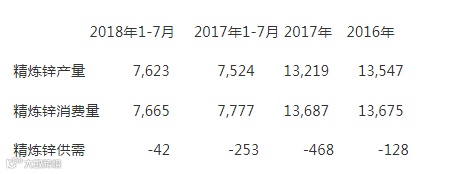 显示,2018年1-7月全球锌市场供应短缺4.2万吨,去年同期为供应短缺25.3万吨。 具体细节如下(单位:千吨)