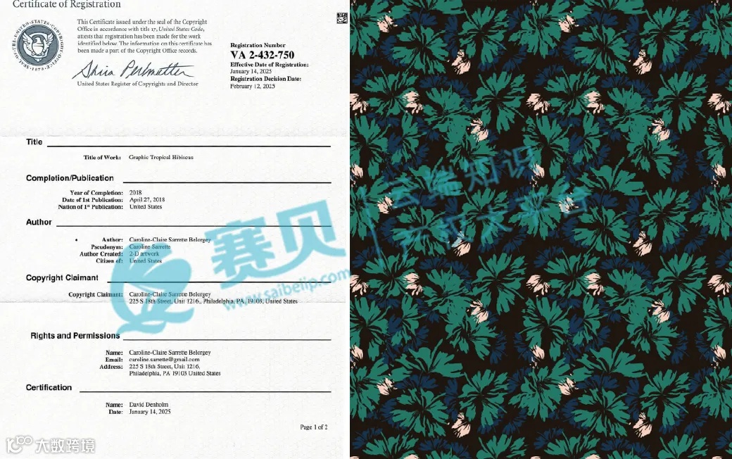 涉案作品《Graphic Tropical Hibiscus》已于2018年完成美国版权注册(注册号:VA2-432-750)。该作品以深色为底,搭配浓郁绿与浅米色芙蓉花叶片,形成重复规整的满铺纹样。跨境卖家需注意:未经授权使用此类图案可能导致版权侵权风险。
