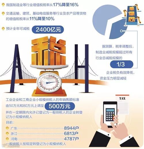 从5月1日起,我国制造业等行业增值税税率从17%降至16%,交通运输、建筑、基础电信服务等行业及农产品等货物的增值税税率从11%降至10%,预计全年可减税2400亿元。