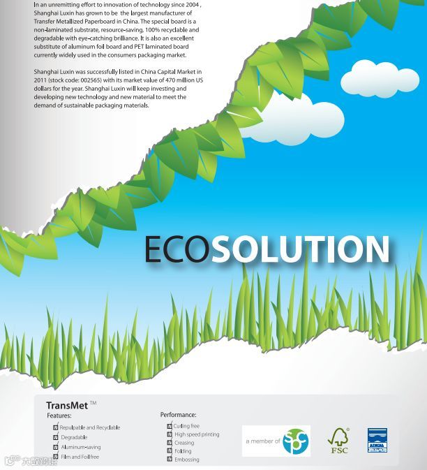 传统的铝箔复合纸和PET复合纸是多材料复合产品,不能回收使用也无法在土壤中自然降解,因此丢弃后会对环境造成污染。顺灏股份生产的真空镀铝转移纸是不含塑料薄膜的单一材料,经验证,当包装产品使用价值结束,由于铝层极薄,纸可回收再造,铝层可自然降解,产品实现一个生命周期的循环,整个过程安全无害,利于人体与生态健康。